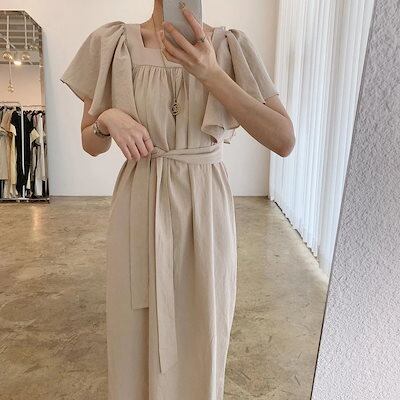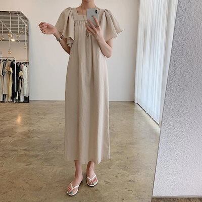 韓国/スクエアネック/鎖骨見せ/ロング丈/万能/気質/ワンピース/コットンスカート カップ 付きインナー
