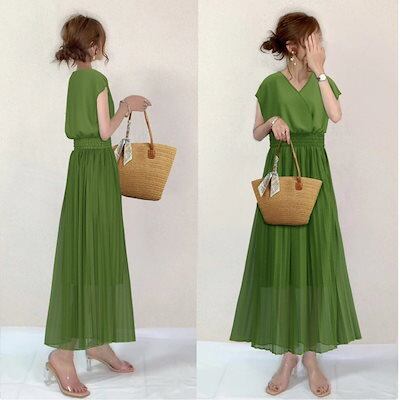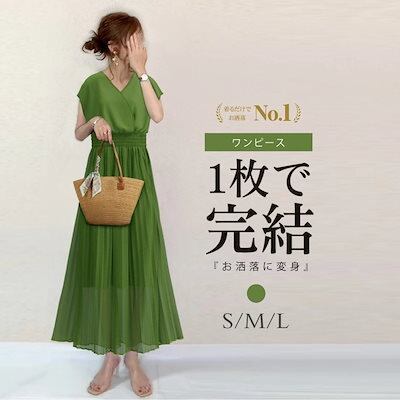 夏/新作/気質/Vネック/薄手/タイ/ウエストゴム/ドレス/カップ 付きインナー