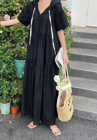 新作/レディース/ミドル丈/ワンピース/フード付き/ゆったり/カジュアル/スプライシング/ケーキドレス/大きいサイズ カップ 付きインナー