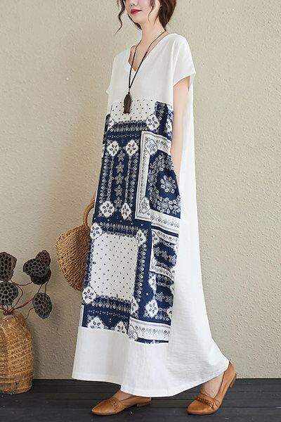 「ファットガール」 夏物/リネン/プリント/大きいサイズ/レディース/Vネック/ロング/ワンピース 日焼け止め ドレス メガ割