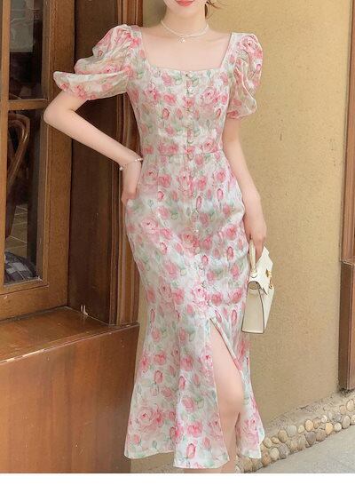 【お勧め商品】 ピンク花柄ワンピース 半袖 スリット フリル スクエア襟 ロングワンピース 夏 着痩せ レディース ワンピース 「W.D」 メガ割