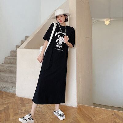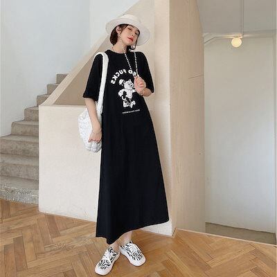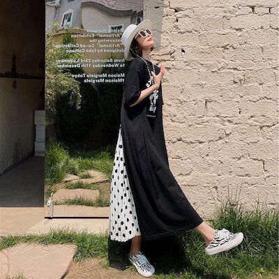夏 新作 Tシャツ ワンピース 半袖 ワンピース ラウンドネック 色切り替え 水玉模様 シフォン ワンピース 大きいサイズ ロング ゆったり 着やせ 体型カバー