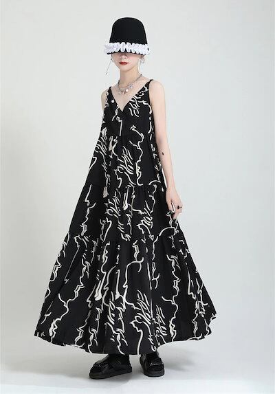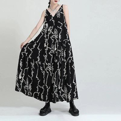ヘビロテ! キャミワンピ 【上品】夏 キャミワンピ一ス ワンピース ノースリーブ プリーツ 高級感 花柄 コントラストカラー ロング ケーキワンピース ゆったり Vネック 大きいスカートの裾 流行り