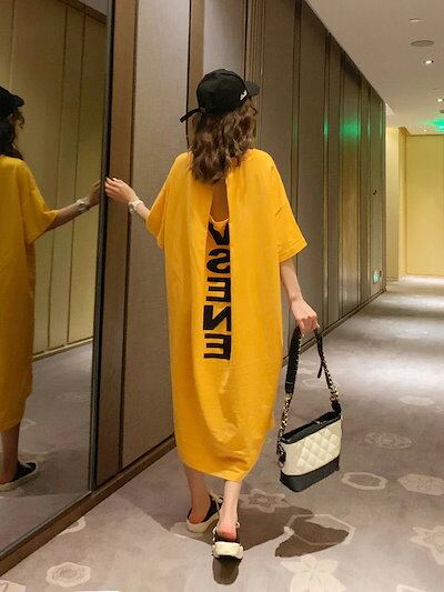 ヘビロテ! キャミワンピ 夏 韓国 ワンピース Tシャツ 綿 ゆったり スリット バックレス デザイン お肌に優しい 大きいサイズ ラウンドネック 着やせ カジュアル 部屋着