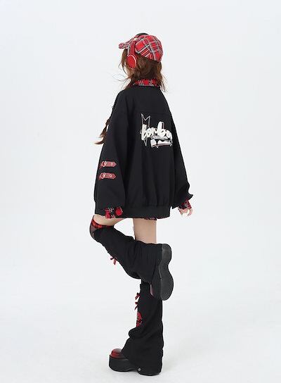 ジャケット サブカルプリントプレイドスプライスベースボールジャケットブラウストップルーズ秋冬レディースジャケット