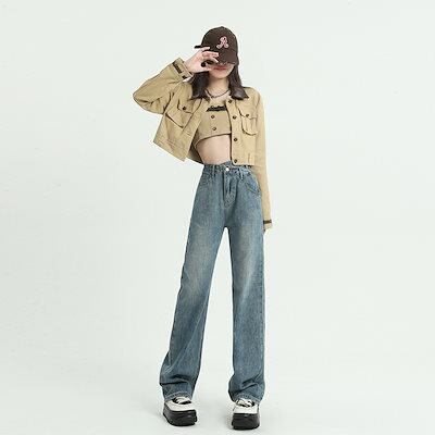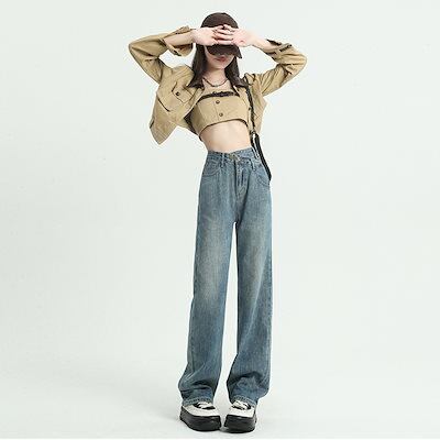 デニムパンツ ヴィンテージストレートジーンズ女性ハイウエストルーズワイドレッグデニムパンツ