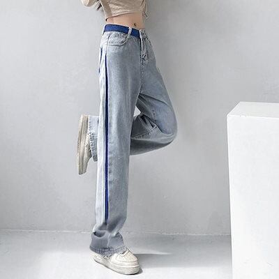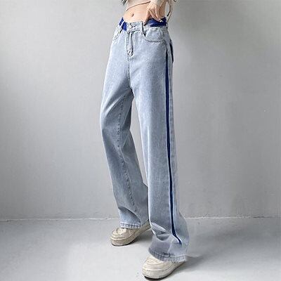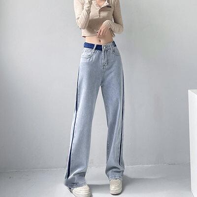 デニムパンツ レディース ジーンズ配色ストレートデニムパンツ ハイウエスト