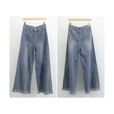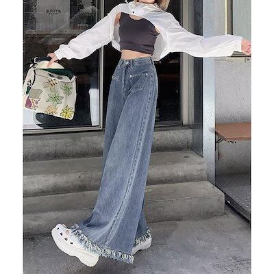 デニムパンツ レディース ジーンズ ワイドデニムパンツ 裾フリンジ ジーパン
