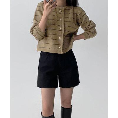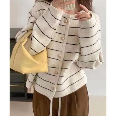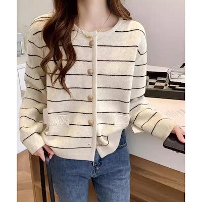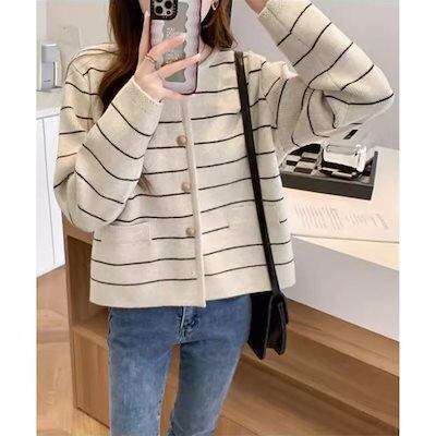 細ボーダーニットカーディガン レディース ニットカーディガン 秋冬 リブニット