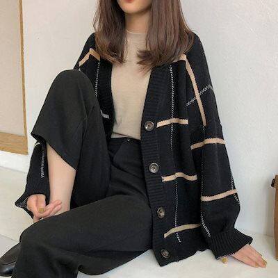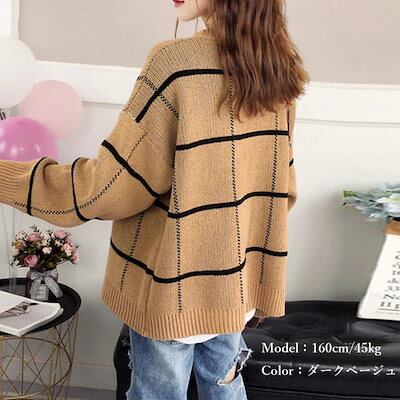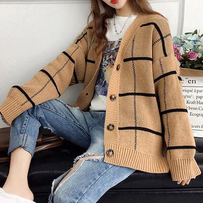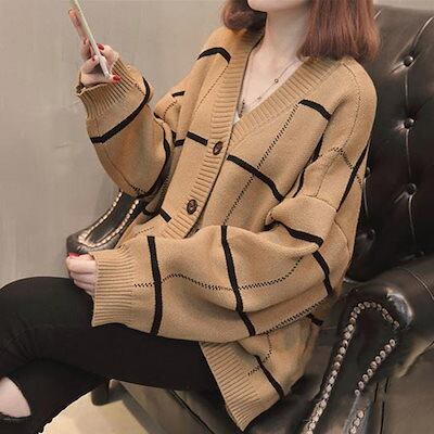 ニットカーディガン BIGチェック柄秋冬 ニットカーディガン 秋冬 リブニット