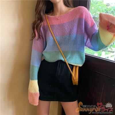 レディース ダンス 衣装 ヒップホップ 長袖 ニット レインボーカラー 太ボーダー 透かし編み ふん