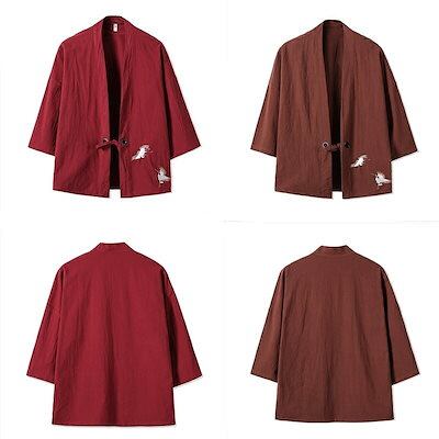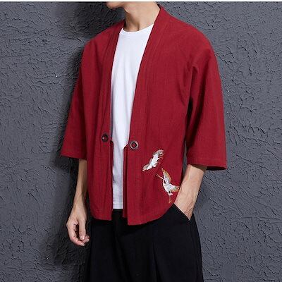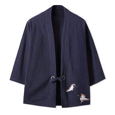 羽織 メンズ 着物カーディガン 開襟シャツ 和式コート 浴衣風 鶴柄 七分袖 トップス カジュアル