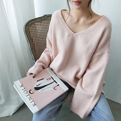 2023 ニット 韓国 オールマッチセーター Vネックゆったり 長袖ニットセーターミドル丈