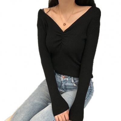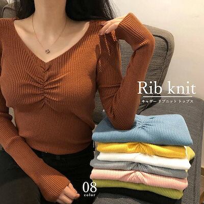 2023 ニット ニットトップス レディース 秋冬 キャザー Vネック 長袖 ポリエステル 細見効果 リブ
