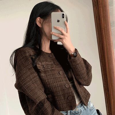 [秋の新作] プレーン ラウンドネック セミクロップ ツイード ジャケット - jk