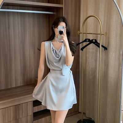 [*高級美* 結婚式ルック] 24ss シルク ドレープネック バックル ミニワンピース 袖なし ピンタック ワンピース 夏 ホカンスルック デートルック