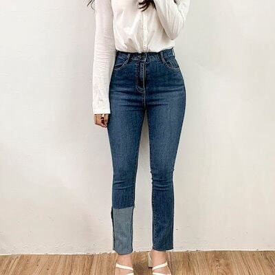 ハイウエストダークブルー ロールアップ アンバランス スキニージーンズ