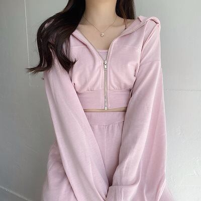 [単品購入可能!/パステル4colors] マシュマロ長袖クロップファスナーポケットパーカージップアップ + クロップひもキャミソールツーピースset (4colors):リトルフェアリー