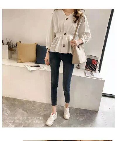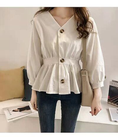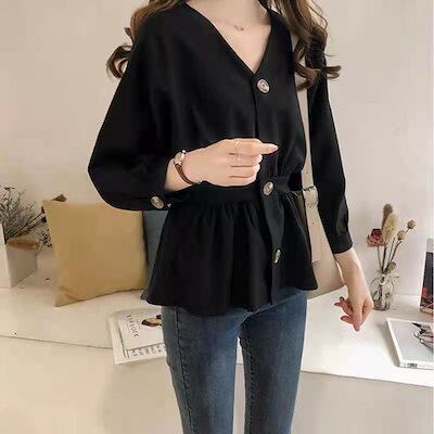 今っぽシアーシャツ 2024春の新気質ウエストが細く見えるVネックシャツ韓国版シャツ長袖