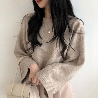 ニットセーター 秋セーター女性ルーズ半長袖ラウンドネックプルオーバーニットトップス