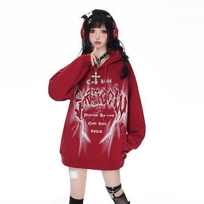 パーカー 黒と赤のレトロなルーズなフード付きのスウェットシャツレディース秋と冬のファッションプルオーバースウェットシャツ