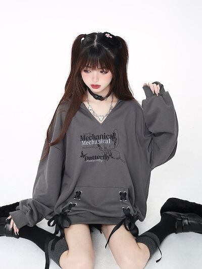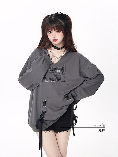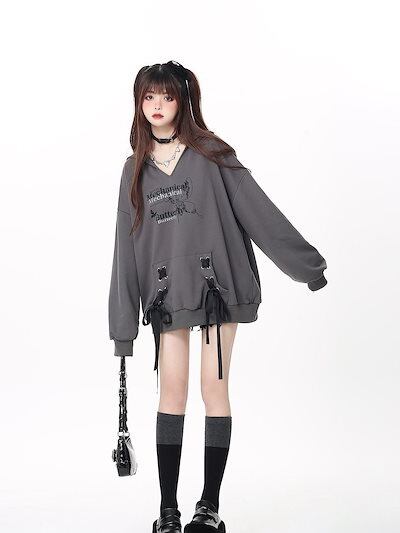 パーカー Vネックニッチルーズカジュアルタイミドルレングスヴィンテージフード付きスウェットシャツ女性