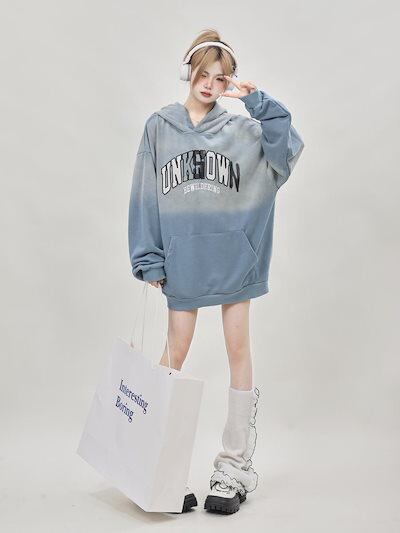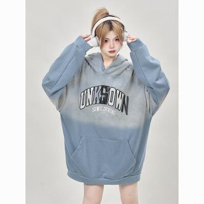 パーカーレトロな小人数水洗染めグラデーションブルーのフードコートの新しいトレンド
