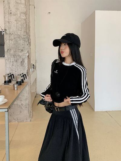 2024 秋冬セットアップ サイドライン ロゴ トップス ロングスカート スリムフィット ロンT 長袖 レトロ 韓国ファッション レディース スポーツミックス カジュアル