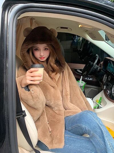 可愛い フェイクファー フード付きアウター 秋冬 ゆったり 百掛け 毛皮コート レディースファッション 厚手 ジャケット トップス