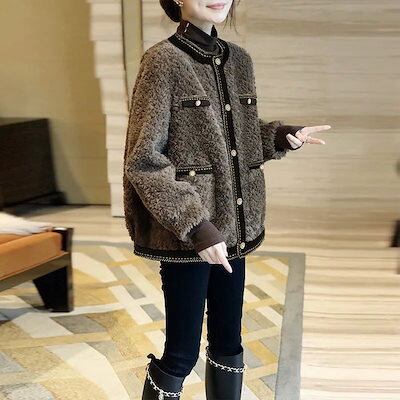 ブラウン モコモコ ジャケット レディースファッション 小香風 アウター 秋冬 気質 トップス フェイクカシミア ノーカラージャケット