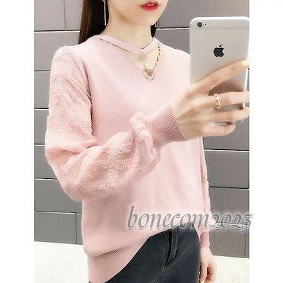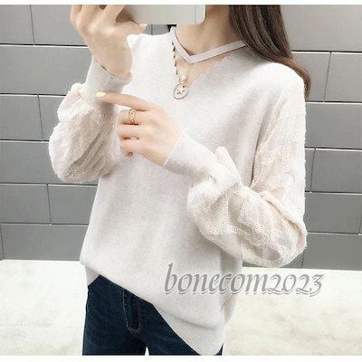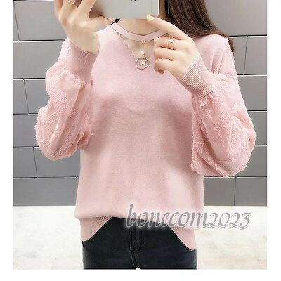 レース切り替え ニットトップス ゆったりセーター 無地ニットトップス 秋冬代長袖トップス レディース オシャレ 大人可愛い 韓国風 ネック プルオーバー