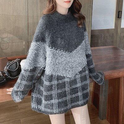 長袖 チェック柄 ニットワンピース レディース秋冬 チュニックトップス 色 ライン ニットソー 上品 ロング丈ワンピ 通勤 ニットセーター 風
