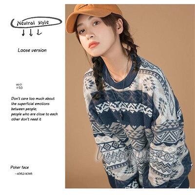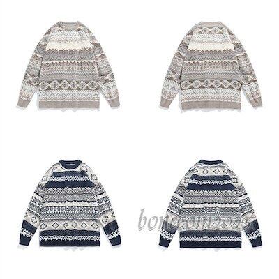 あったか ニットカーパー 長袖 ニット 秋 ペアルック レトロ 和風 ラウンドネック 厚 幾何柄 かっこい カーパー セーター レディース 丸首 メンズ 冬