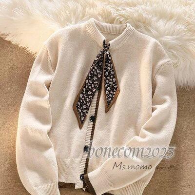 オシャレ韓国風 プリントリボンネック ゆったりプルオーバー 大人ニットインナー ショット丈セーター 秋冬代長袖セーター レディース ニットトップス