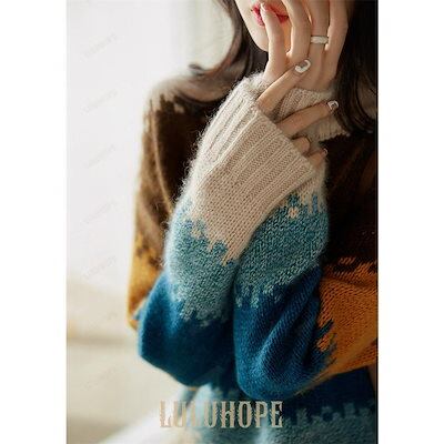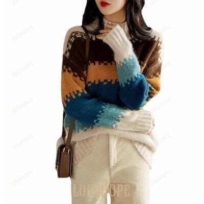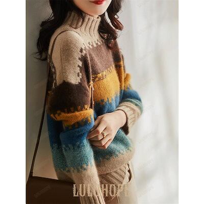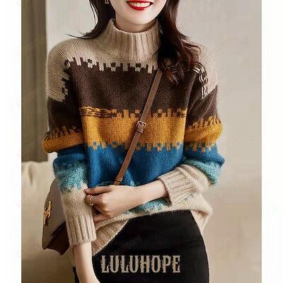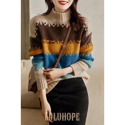 セーター 大人ニットインナー代 ニットトップス ショット丈 秋冬代長袖セーター ゆったりプルオーバー ボーダー柄ハイネック レディース 厚手 オシャレ
