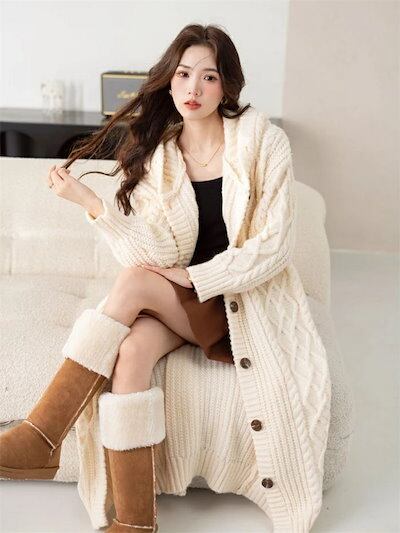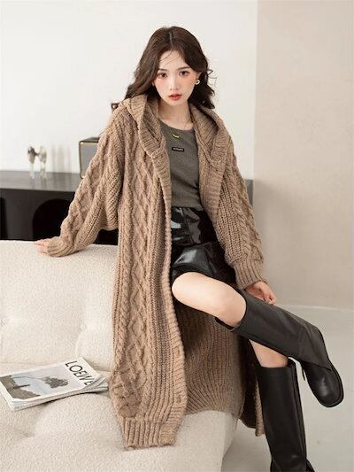 ニットカーディガン ニット セーター レディース ニットセーター 秋冬 カーディガン 長袖 無地 羽織 ケーブル編み ロングカーディガン ロング丈 カットソー フードニット フード付き アウター レイ