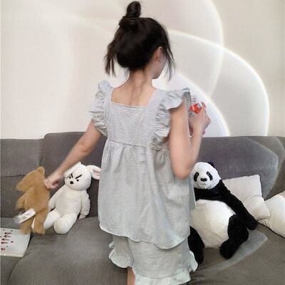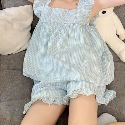 夏の準備!ノースリーブパジャマ ルームウェアノースリーブの薄手のアウタースーツ部屋着2023夏の新作木製耳元シンプルパジャマ2着レディース 韓国ファッション