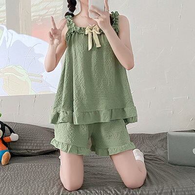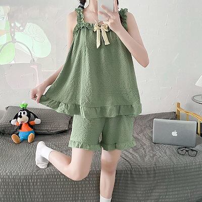 夏の準備!ノースリーブパジャマ ルームウェアサマースーツキャミソールパンツリボン薄手可愛いカジュアルビッグサイズ2点セットレディース 韓国ファッション