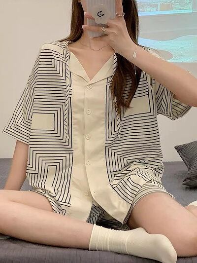 パジャマ ルームウェア 夏の新作半袖半ズボンカジュアルストライプ寮は部屋着スーツを外着できる レディース 韓国ファッション