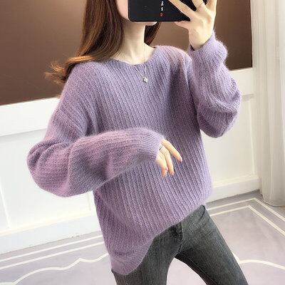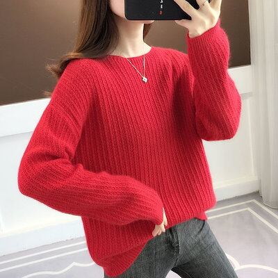 純色プルオーバーニットレディース秋の新作ゆったり丸首長袖トップスアウターセーターカーディガン