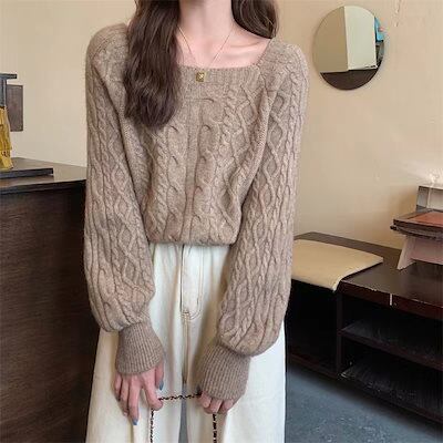 ツイスト スクエアネック セーター レディース ショットタイプ 秋冬 ゆったり 着痩せ アンダーウェア ニットカーディガン