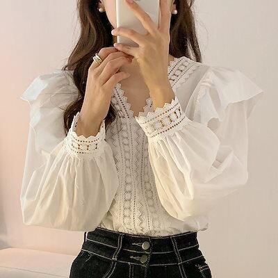 可愛い レディースVネック ラッフル オフィス ブラウス ゆったり カジュアル バブル袖 ブラウス トップス ワイシャツ 韓国ファッション レディース 紫外線対策 ロンt シフォンブラウス