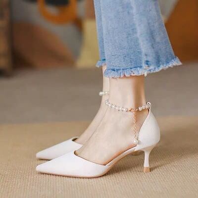 フランス パール ハイヒール レディース 新品 ローヒール 気質 ポインテッドトゥ パンプス 通勤靴