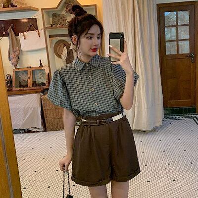 涼しく楽ちんセットアップ 夏服 セットアップ ジャージ 上下セット半袖 レディース 新作2点セットサマーレトロゆったり格子バルーンスリーブシャツ+ハイウエストワイドパンツ レディース 韓国ファッション