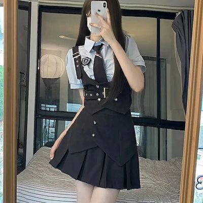 涼しく楽ちんセットアップ 夏服 セットアップ ジャージ 上下セット半袖 レディース 韓国ファッションッ jk制服学院風グレー収納ウエスト痩せベスト半袖シャツプリーツスーツ夏 レディース