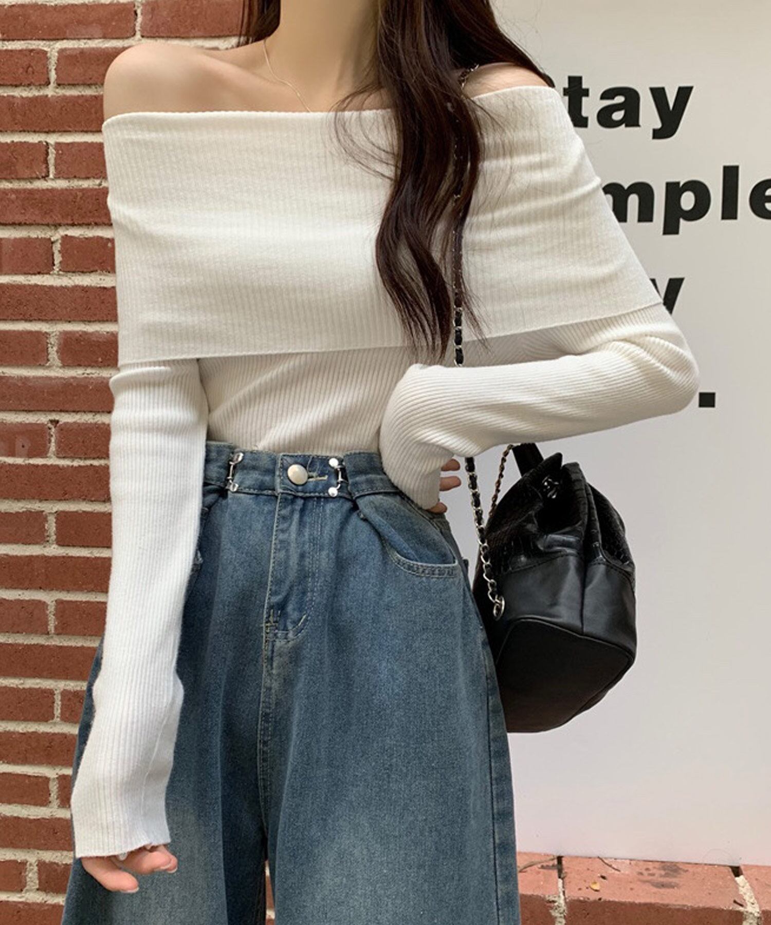オフショルダー リブニットトップス 【即納】 長袖 シンプル レディース 韓国 プチプラ おしゃれ