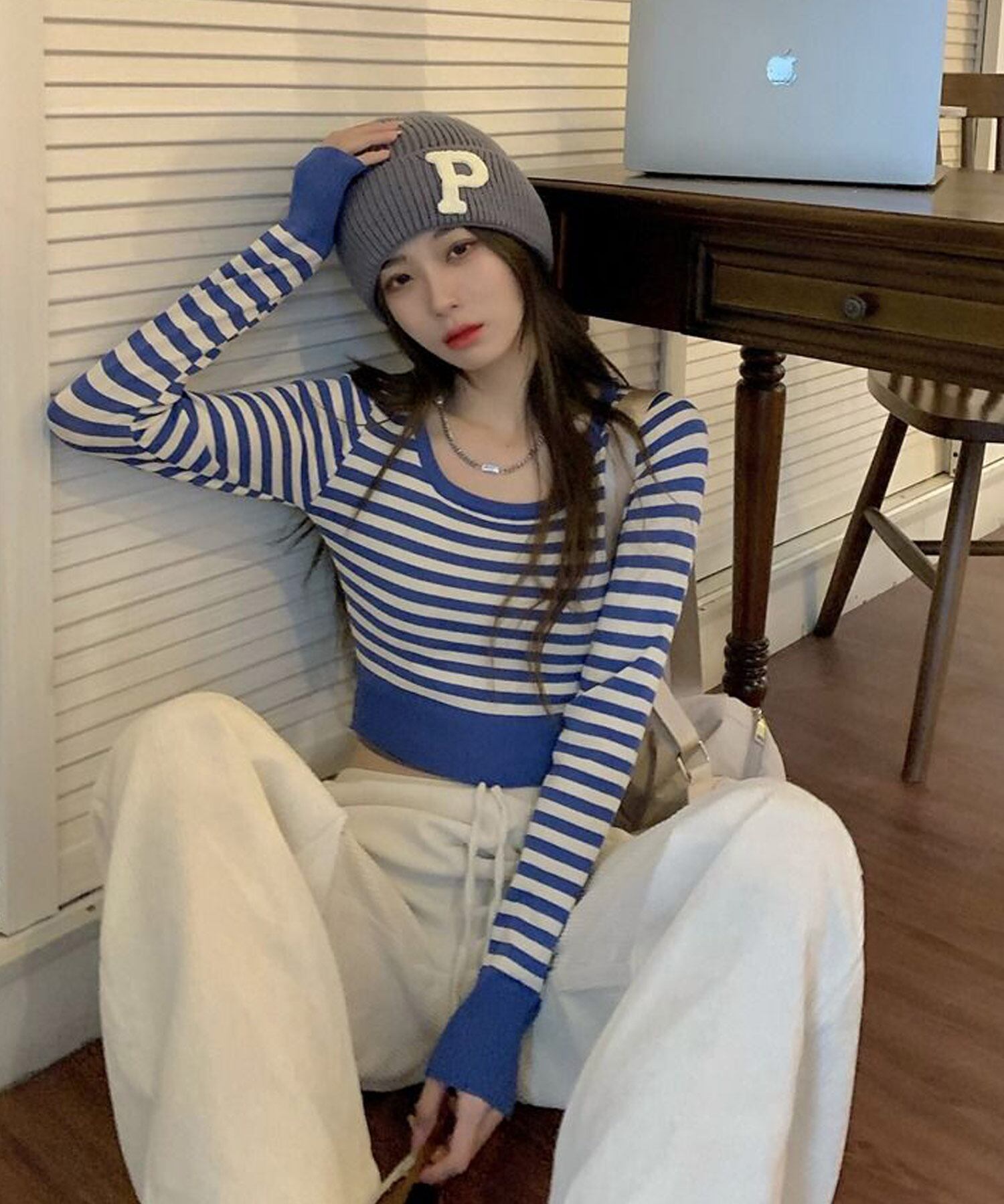 ボーダー クロップド丈 ニットトップス 【即納】 トップス 長袖 レディース 韓国 プチプラ おしゃれ