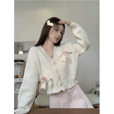 ニットセーターリボンVネック長袖セーターコート女性の秋2022新型甘くゆったりショート丈ニット