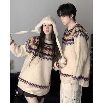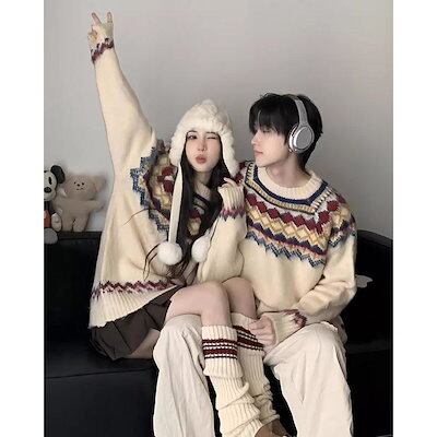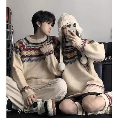 セーター ペアルック メンズ レディース ニット ベージュ 秋冬 カップル 恋人 親友 友達 姉妹 韓国 おしゃれ 可愛い 暖かい トップス 旅行 S M L XL 2XL 3XL