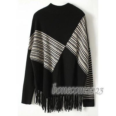 ニットトップス レディース 秋冬30代長袖セーター ボーダー柄 フリンジ スリーブ マント型 丈セーター ゆったりプルオーバー オシャレ韓国風